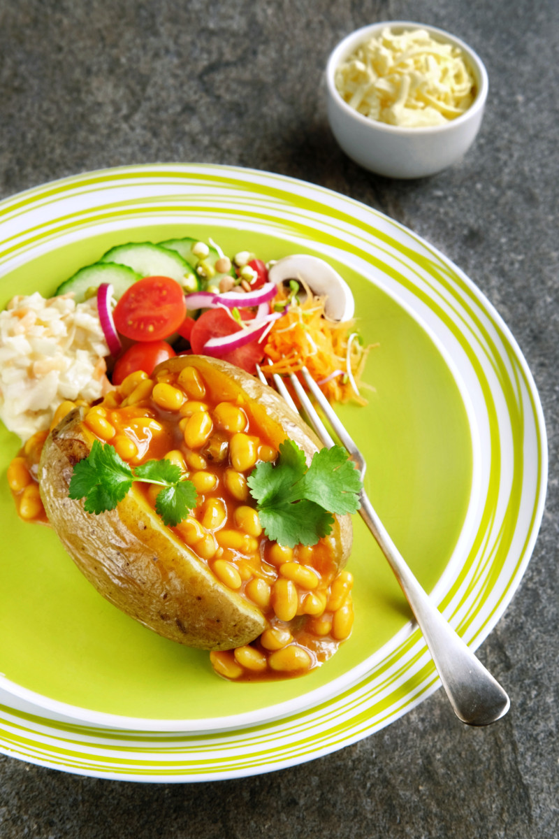 The humble baked potato is a cheap, tasty and potentially nutritious meal. The number of fillings is almost endless. Beans and cheese are the obvious choice, but here are a few you may not have tried. To speed up the cooking of your potato, prick it with a fork and microwave for 10 minutes. Then place in the oven for 10 minutes at 200°C/400°F/gas mark 6. I sometimes drizzle a little olive oil and sprinkle salt onto the potatoes before they go into the oven. Delicious!